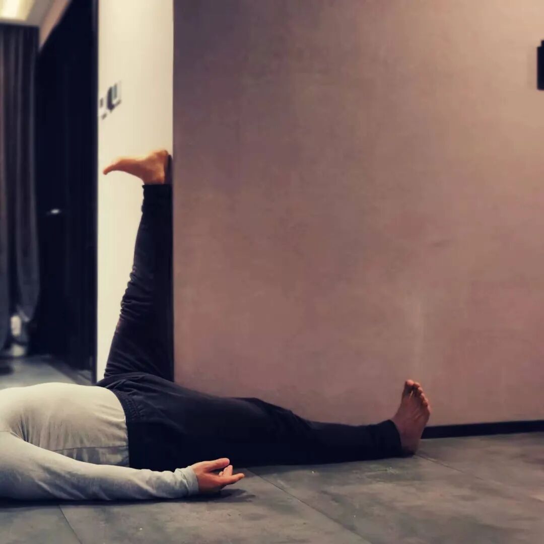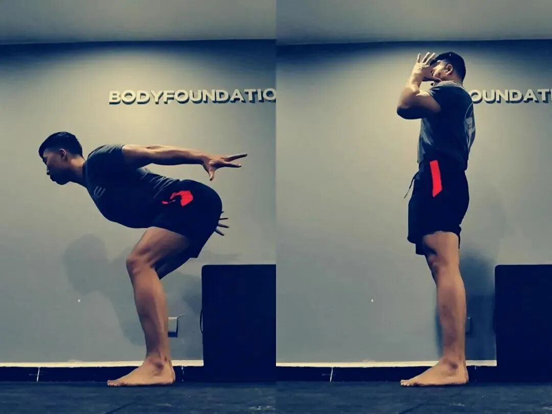 注意:在这个动作中,首先需要做的是静态保持,接下来是前后的移动,最后是单侧小腿的上提(如下图2),如果你的灵活度很欠缺,我建议你一步一步来。