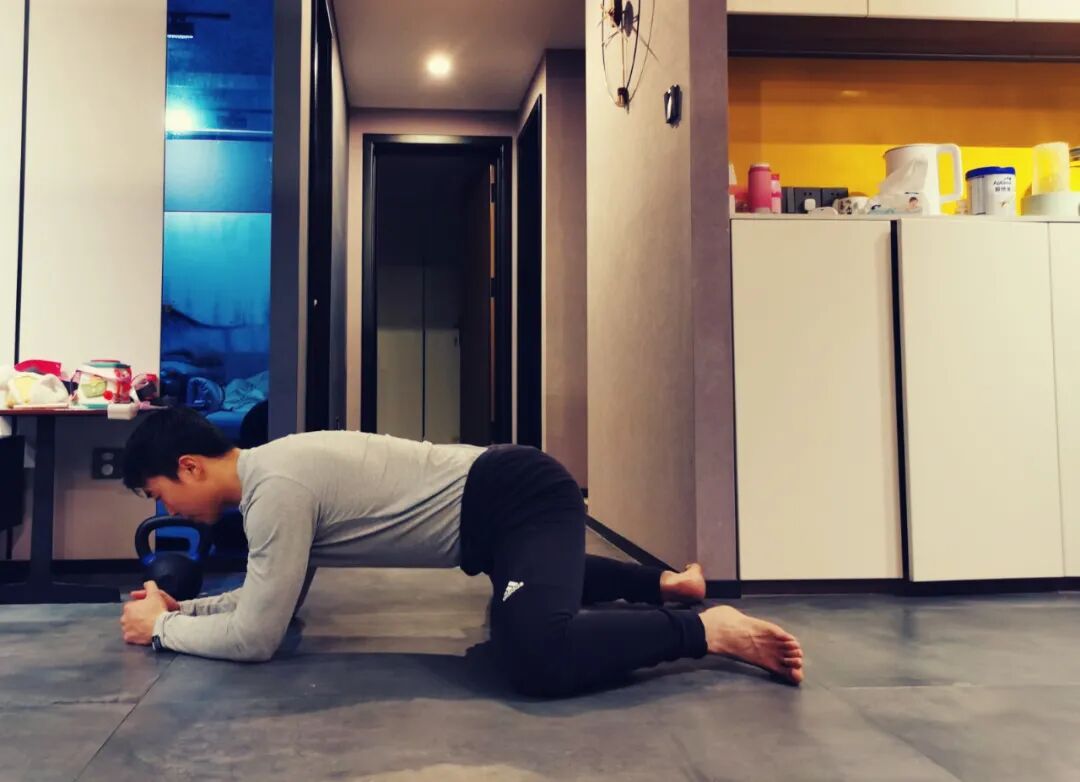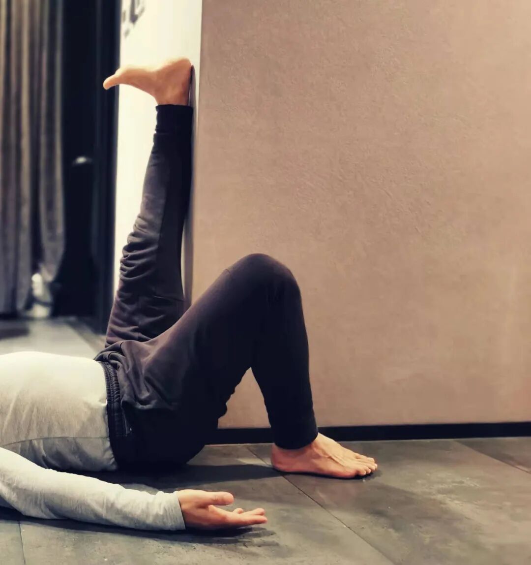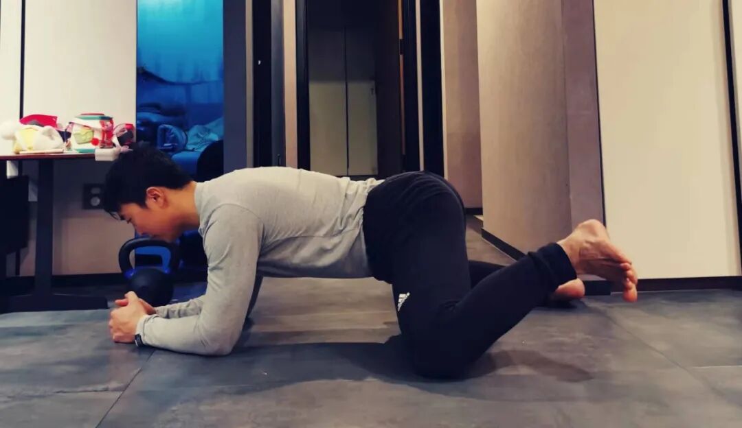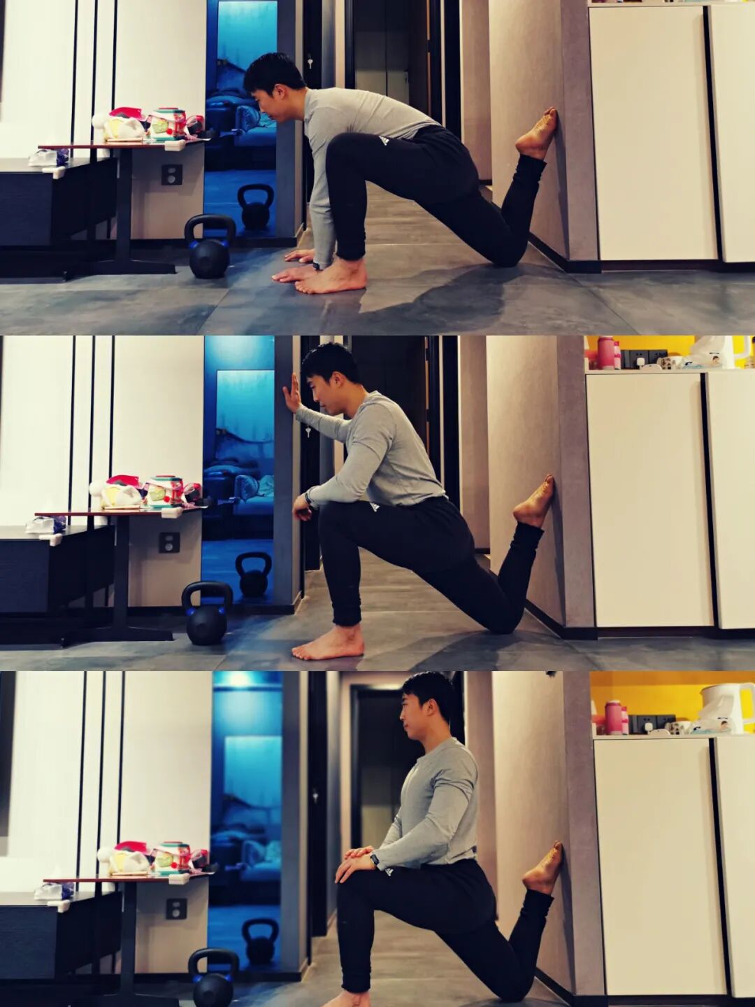 注意:选择屈膝来完成这个动作会比较简单,对于缺乏运动的人群非常友好,待伸展度提升以后,就可以增加难度,如下图2.