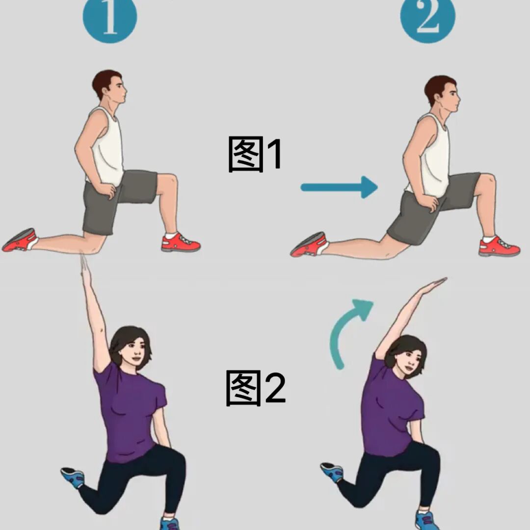 3.关于髂腰肌的拉伸,这个需要讲一下,图1是大家常用的髂腰肌拉伸方式,很多人为追求动作的幅度,选择将膝盖向前顶出去,这是一个误区。这个动作的执行并不需要很大的幅度,只需要原地调整骨盆位置,即让倾向于前倾的骨盆更多的转为后倾,腹部紧绷,然后轻微向前移动重心。所以,像图2这种手臂举高的进阶动作,对于很多人完全没必要。4.激活部分的动作选择,要简单,无挑战,不必拘泥于次数和组数,重点感觉肌肉是如何工作的。5.最后一个部分往往是最容易被忽略的,肌肉被唤醒不意味着能够在具体的运动中正确使用,所以需要一个“动作模式练习”作为过度。