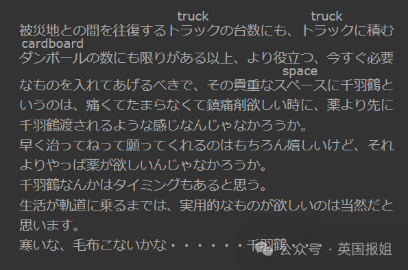 “往返于受灾地之间的卡车数量、卡车装载的纸箱数量都是有限的,所以应该把更有用的、现在马上就需要的东西放进去,在这么宝贵的空间里放千纸鹤,实在是让人心痛。