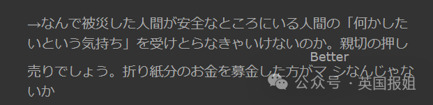 “为什么我们这些受灾的人,还要被迫接受那些身在安全地区的人所谓的‘要为灾区做点啥’的心情?说到底折纸鹤这种事儿不过是展示自己的善意罢了。