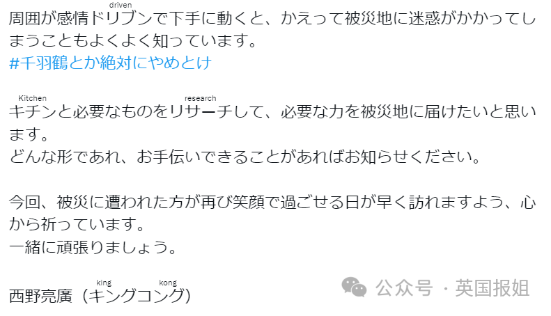 其中关注度比较高的是艺人西野亮广的发言,他提到自己在1995年的阪神大地震中体会过作为灾民的心情。希望大家能真正做些对灾区有用的事儿,千万千万别寄千纸鹤。