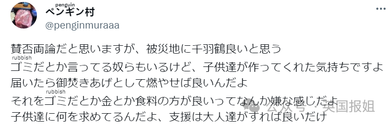 把千纸鹤说成垃圾,觉得不如食物和钱就有点过分了吧,你也不能要求孩子们直接捐钱,毕竟捐钱捐物资是我们大人的事情。”