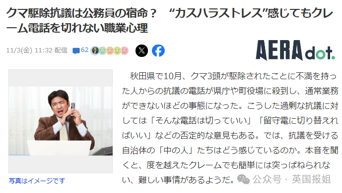 在“熊患”最严重的秋田县,只能起到安抚作用的公务员,每天都被熊目击后受到惊吓的民众骂得狗血喷头。他们中有的患上心理疾病,辞职的不在少数。