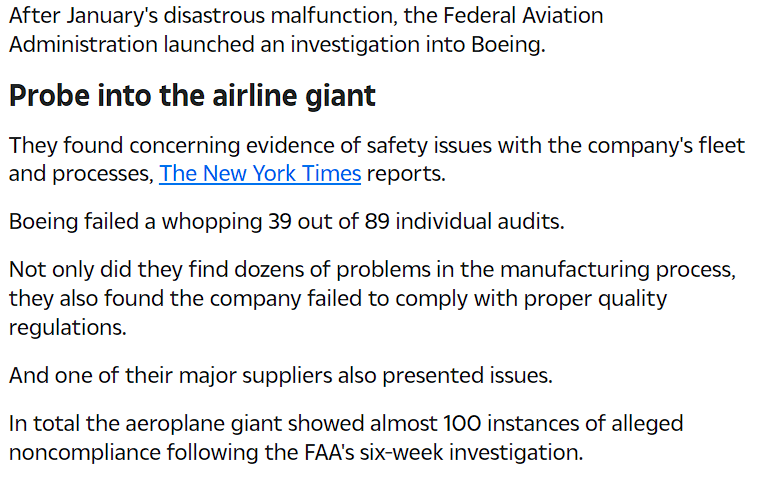 (一月份的灾难性故障后,FAA重新审查波音,89项单独审计中有39项未通过,此外有近100起涉嫌违规的事件)