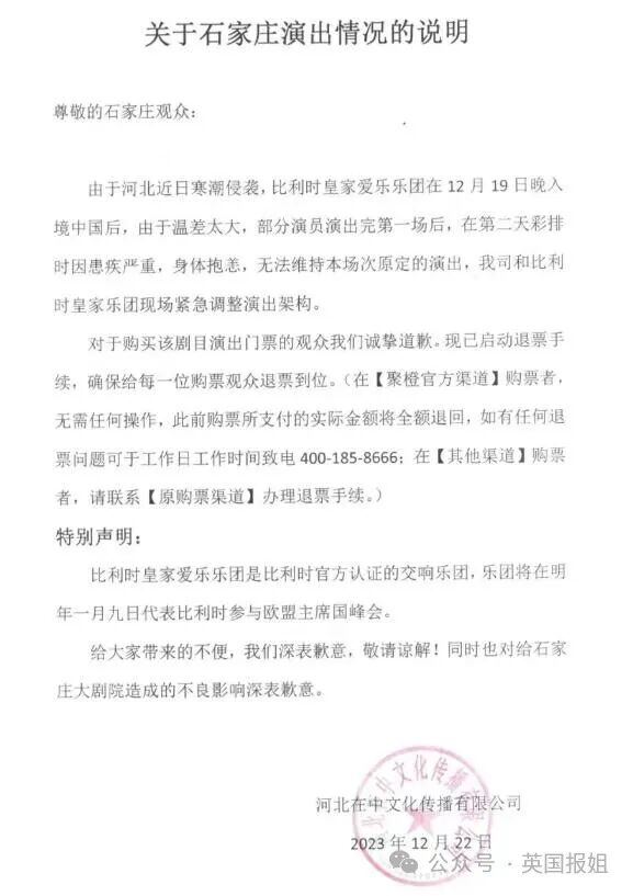 随后石家庄大剧院发布道歉声明称:比利时皇家爱乐乐团在12月19日晚入境中国后,由于温差太大,部分演员在第二天彩排时因患疾严重,身体抱恙,因此无法维持本场次原定的演出。会及时启动退票手续,向全体观众诚恳道歉。