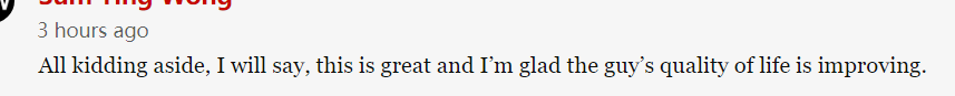 “不开玩笑地说,这事儿确实很棒,很高兴这哥们的生活状况得到了改善。”