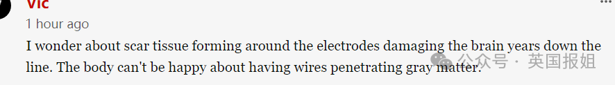 “我想知道电极周围形成的疤痕组织多年后会不会损害大脑,毕竟大脑灰质(中枢神经系统的组织)可不会欢迎外部植入的异物...”
