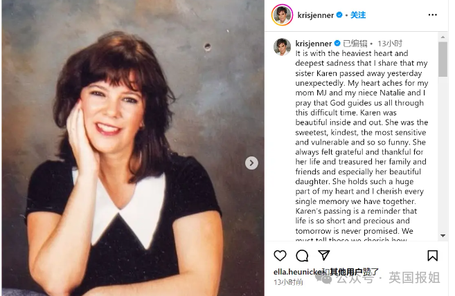 但更多的人,还是在感叹,凯伦和克里斯和解也没有几年,她就这样离世,实在是没想到……