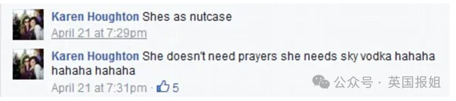 她还在 Facebook上幸灾乐祸地写道: