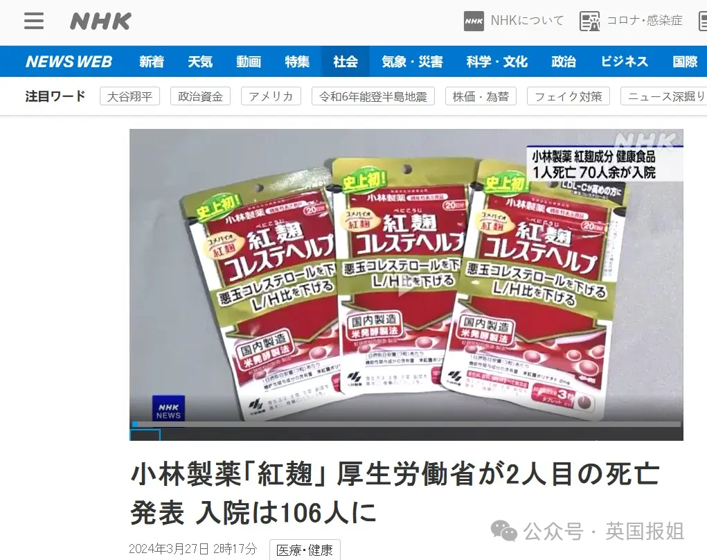 3月25日,日本小林制药公司公布:33人出现健康异常,其中26人住院。
