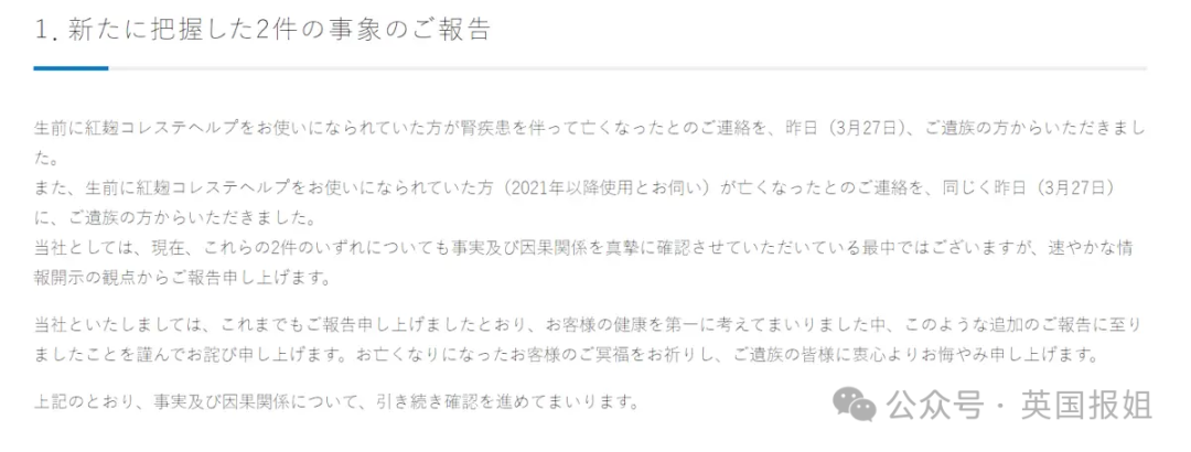 小林制药事件又曝出新进展:今日该公司宣布,又有两名服用过该公司含有红曲成分保健品的消费者死亡。