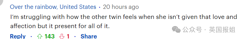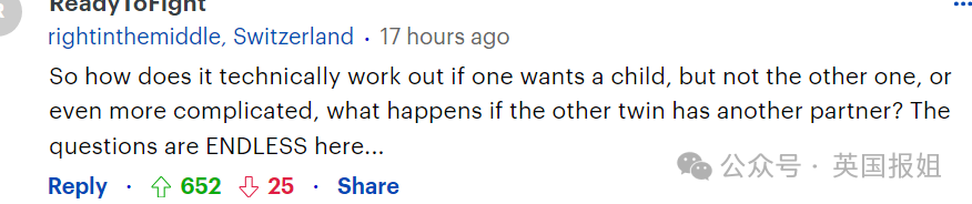 “我在想如果一个人想要孩子,而另一个人不想要该咋办。或者更复杂的一点,如果双胞胎中的另一个人有了另一个伴侣,会发生什么?越是细想就感觉问题越多...”