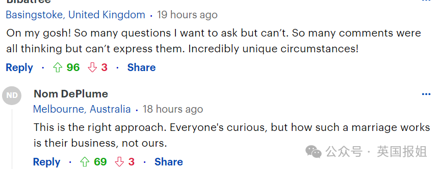 “我倒是觉得这样很对。每个人都很好奇,但婚姻是他们自己的事,与我们无关。”
