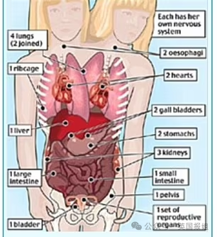 两人共同使用一个身体,从腰部以下,所有器官,包括肠道、膀胱和生殖器官,都是共享的。但他们的饥饿感、排尿和睡眠的欲望却各不相同。
