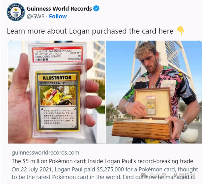 无独有偶,油管网红Logan Paul,在2022年时以527.5 万美元(约3800万人民币)的价格,购入一枚宝可梦稀有卡片,创下了吉尼斯世界纪录。