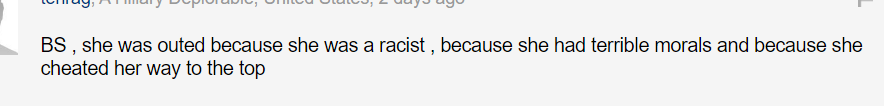 “她被淘汰掉显然因为她是个种族主义者,道德败坏,以及靠抄袭作弊爬上了高层。”