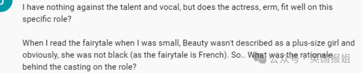 “我并不质疑她的才华和声音,但平心而论,这个选角适合贝儿这个特定的角色吗?