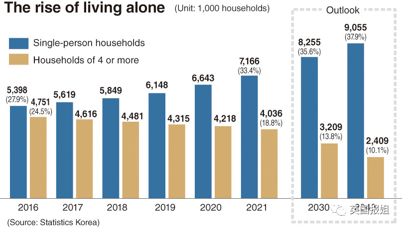 而从韩国全球垫底的结婚率和生育率来看,预计到2040年,每10户家庭中,将会有4户是“一人家庭”。