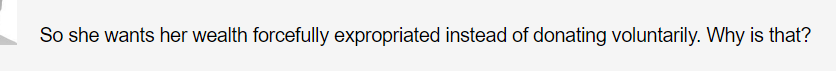她觉得财富的分配就是造成社会不公平的原因:任何人都不应该拥有那么多的免税资金,以及与此相伴而来的巨大权力。
