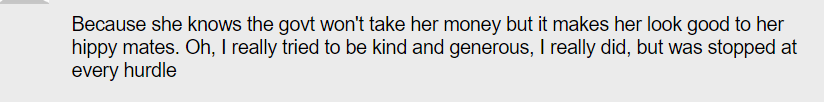 “串通好的吧。她肯定知道政府不会拿走她的钱,所以用这种说法在圈子里树立形象——哎呀我是真的想把钱花出去,但政府一直在阻挠我呢。”
