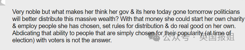 “听着很高尚,但她怎么敢相信朝令夕改的政府和政客们会更好地分配这笔财富?不如创办自己的慈善机构,雇佣自己看好的人,制定分配规则,自己去做真正的好事。
