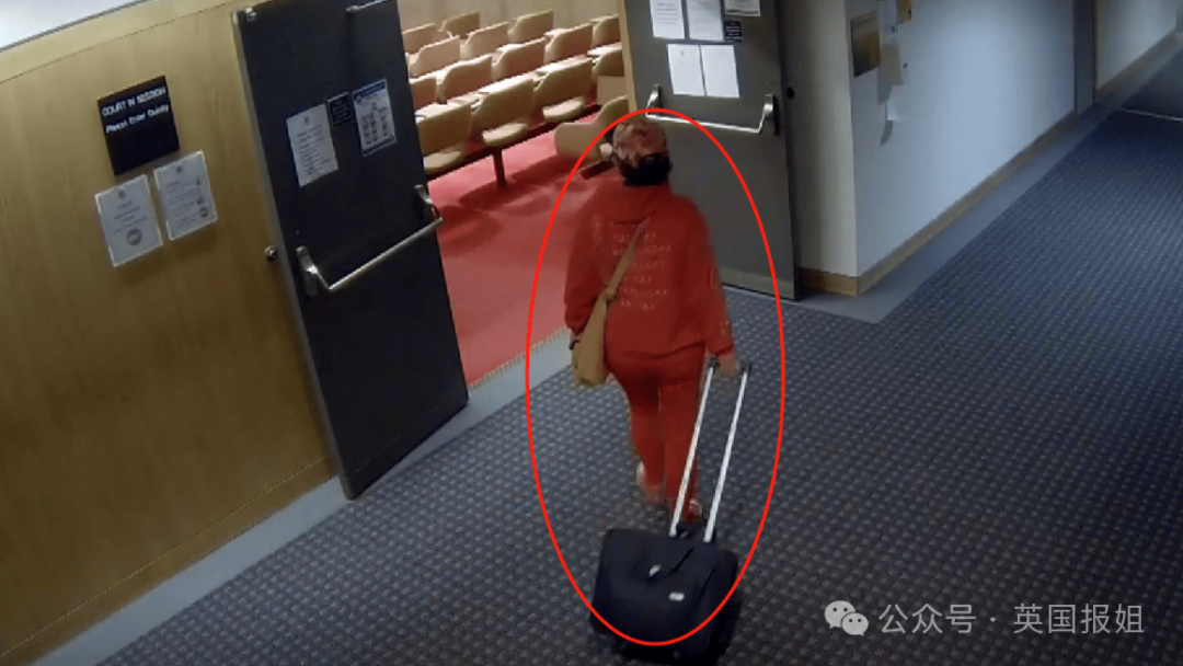 (红圈内:在庭外被拍到的卢某)