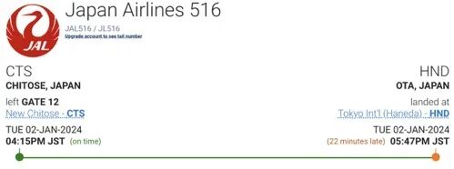 相关航空飞行记录网站显示,该航班是日本航空的JAL516,于下午4点15分从日本札幌的新千岁机场起飞,于日本时间下午5点47分在东京羽田机场着陆,谁想到竟然发生了碰撞起火事故。
