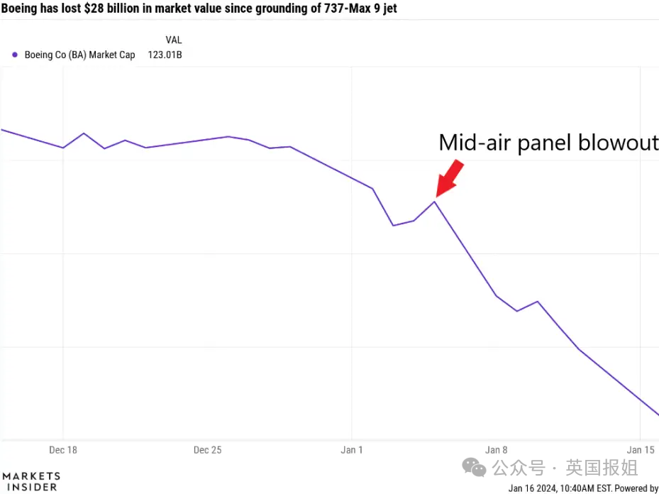 (图源:Markets Insider 1月5日阿拉斯加航空公司掉舱门后股价持续下跌)