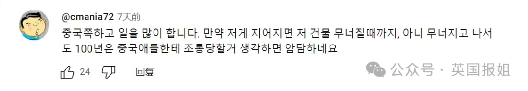 “政府是不是收钱了?塔的位置后面就狡猾地对着唐人街,一切都和中国一模一样。韩国的政治家是不是在用韩国人民的税金,把韩国内部建设成小中国?以后就变成仁川是中国的有力证据。”