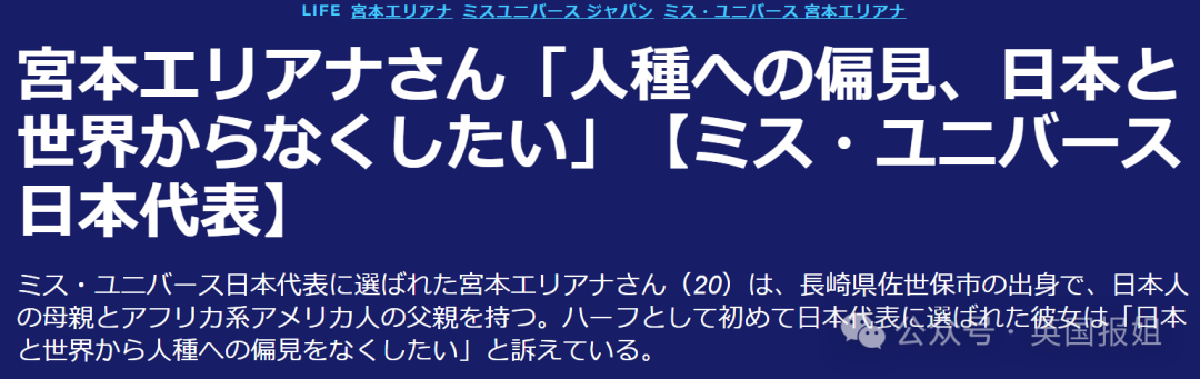 2015年,宫本阿丽安娜成为“日本小姐”冠军,同样引发了舆论爆炸。阿丽安娜生在日本长在日本,但因为是日本人和非裔美国人的混血后代,当时就被批“和日本人的印象相去甚远”。