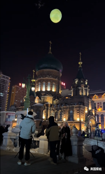 似乎是怕大家远道而来,拍不到索菲亚教堂的绝美夜景,无人机吊着“人造月亮”的景象,也咔咔往上安排,氛围感做到位,大家怼上去就是一顿拍。这也太那个了!