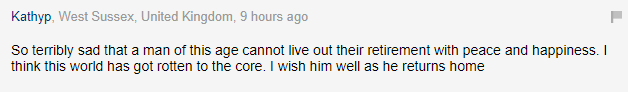 “真是太悲哀了,连这个年纪的老人不能平静幸福地度过他们的退休生活。这个世界已经彻底坏掉了,希望他回到家之后一切顺利。”