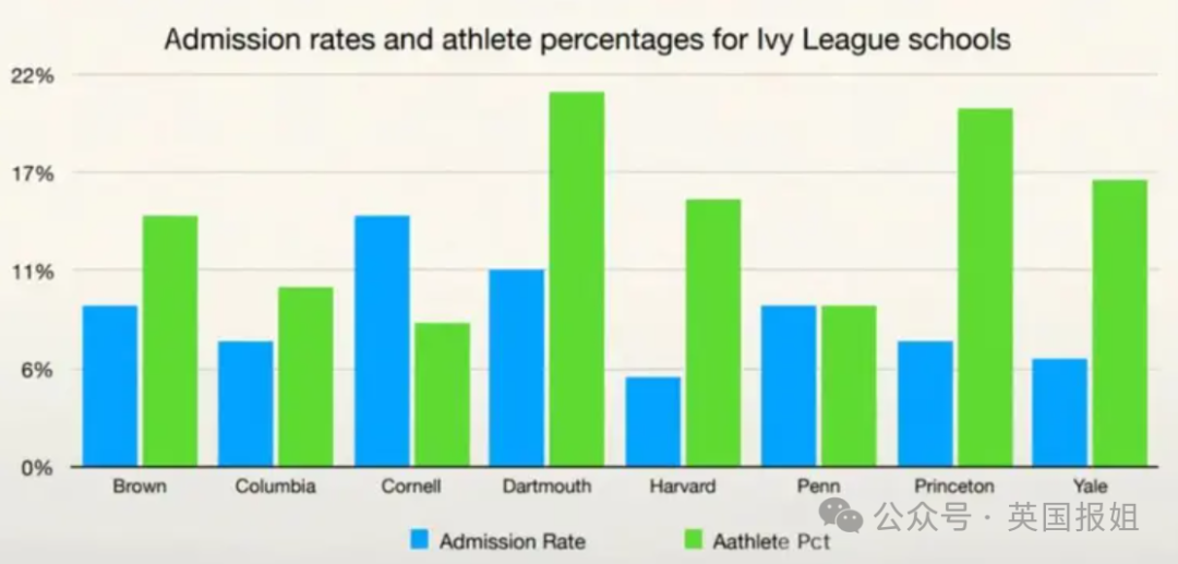 以美国八大常春藤盟校(哈佛大学、宾夕法尼亚大学、耶鲁大学、普林斯顿大学、哥伦比亚大学、达特茅斯学院、布朗大学及康奈尔大学。)为例,这些大学对于体育生的优先录取率远远超过普通学生。