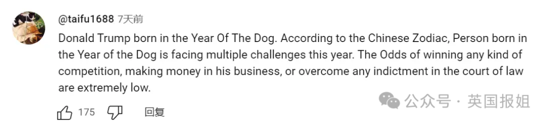“川普出生于狗年,所以他今年将会面临多重挑战,赢得竞争、赚大钱以及赢官司的可能性很低。”