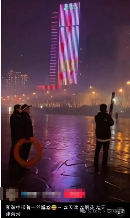 P.S.去年更有人在海河冰面上看到这么和谐的一幕:小伙子自费销毁烟花,警察叔叔在旁边拿救生圈安静守候。