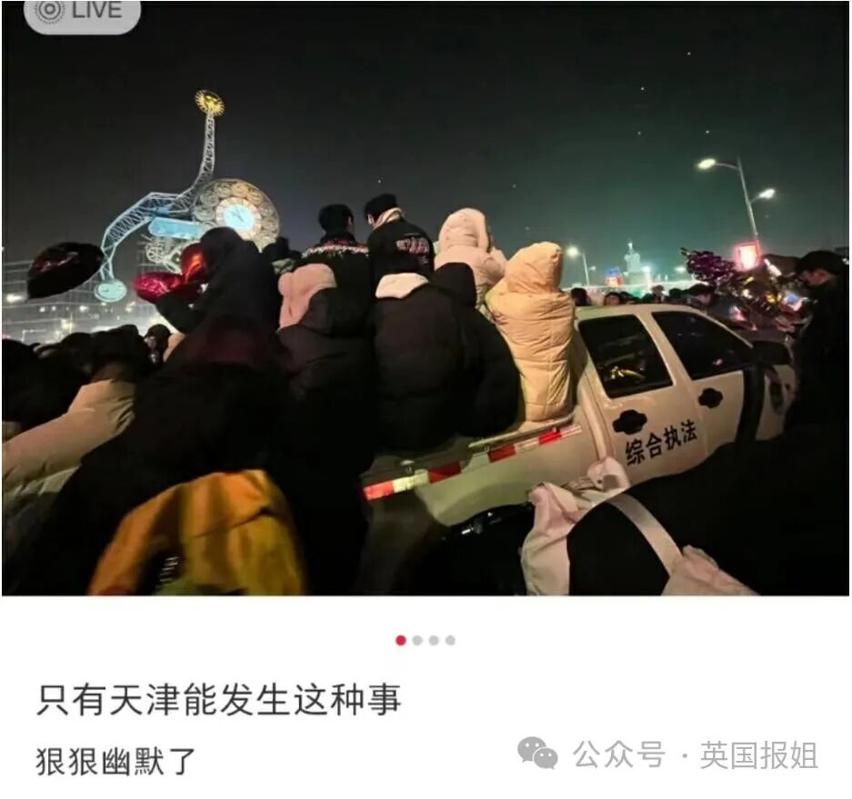 还有人惊奇地发现:你们天津都这么平和吗?怎么还坐着综合执法的车跨年倒数呢?