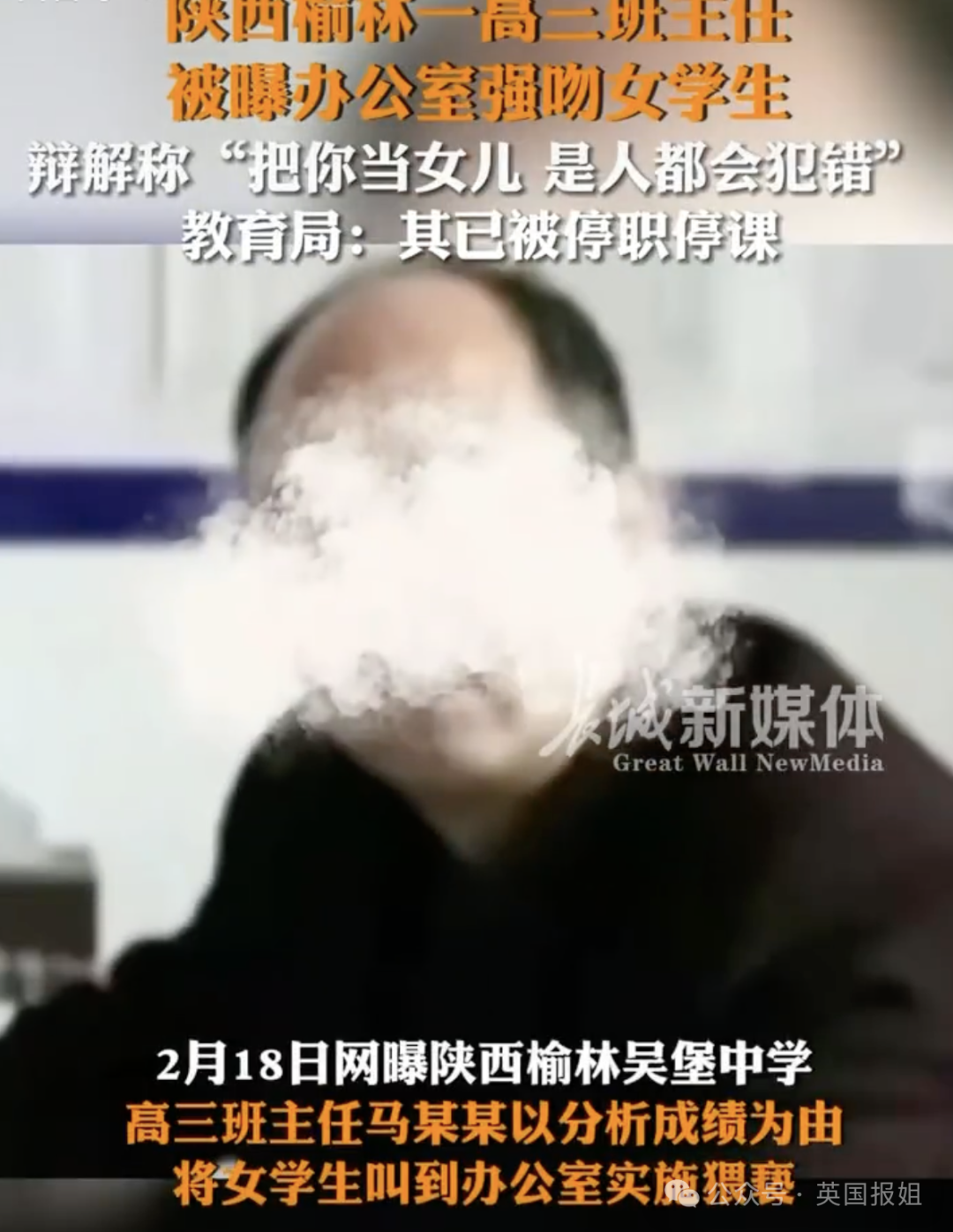 同一时间,另外一件类似的事情也引起热议。陕西榆林一所中学,某高三班主任马某林在办公室强吻女学生,事后辩解这是“把你当女儿”看待。