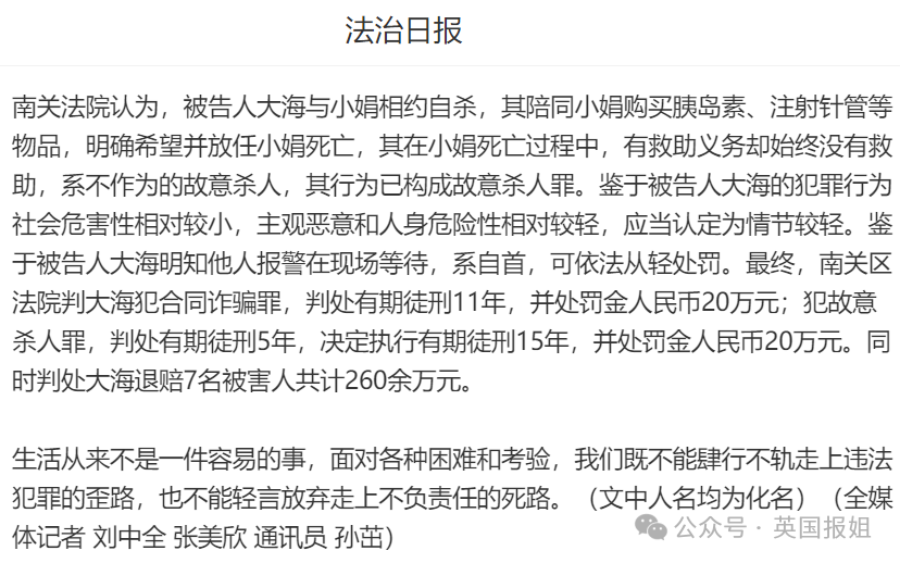 再回到开头国内的案子,在男方帮助女方自杀后,法院以故意杀人罪判处有期徒刑5年,与诈骗罪一起共执行有期徒刑15年。