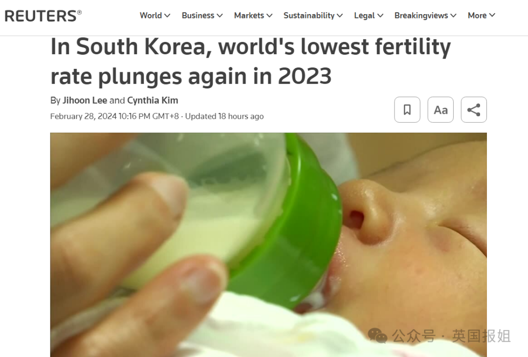 韩国发布的生育率报告依然严峻,2023年韩国生育率再次大幅下滑,韩国女性在育龄期间的平均预期生育数量从2022年的0.78降至历史最低的0.72。