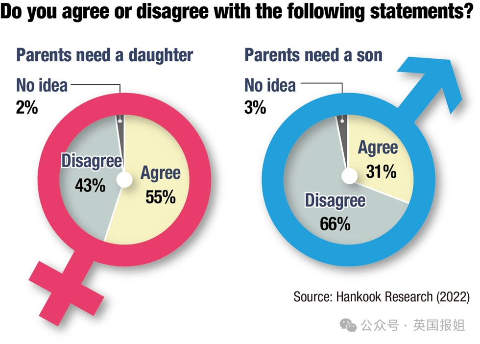 首尔的一家调查公司Hankook Research筛选全国1000多人进行的调查显示,55%的人认为生女孩是必须的,相较之下,只有31%的人认为生男孩是必须的。