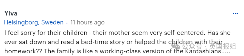 “我觉得这些孩子好可怜啊,妈妈光是以自我为中心,从没给他们讲过睡前故事,辅导过作业。这不就是工人阶层的卡戴珊家族吗?”