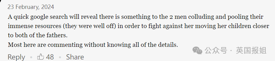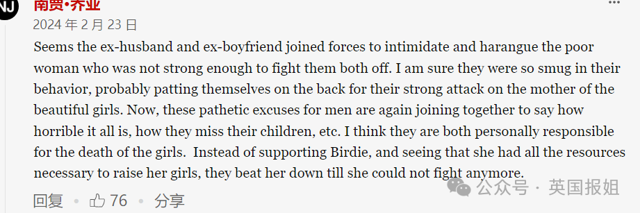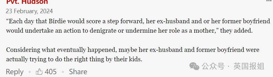 这起悲剧性的事情报道后,网友们也给出了自己的观点,有人认为,正如报道中所说,是人渣父亲们把一家人逼上了绝路。网友翻出法庭记录,提到Birdie是被孩子的父亲们给逼疯的。