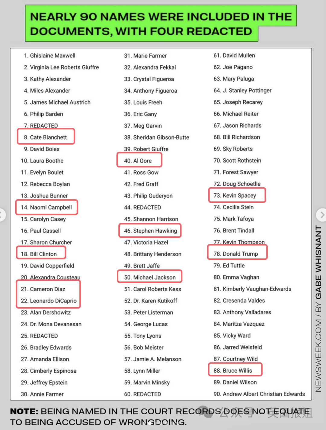 根据目前披露的文件,这些明星似乎都与爱泼斯坦有所交往,他们或是出席了他的派对,或是曾被爱泼斯坦提及。