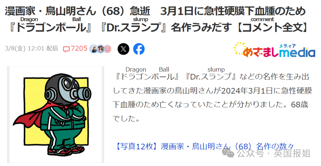 日媒今天上午突发报道,《龙珠》《阿拉蕾》作者、漫画家鸟山明已于3月1日因急性硬膜下血肿去世,终年68岁。