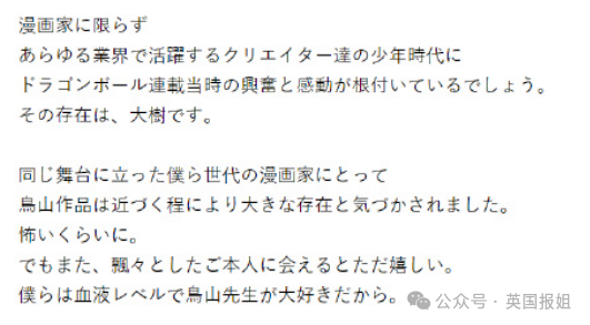 “不只局限于漫画家,在各行各业活跃的创作者们,想必在少年时代,心中都有过看龙珠连载的兴奋与感动。鸟山老师的存在本身,就像是一棵大树。