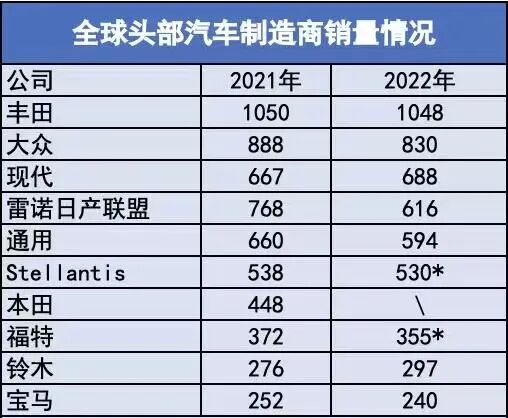 目前,2022年全球汽车集团10强销量排名已经出炉,其中,来自日本的丰田汽车再度超过了1000万辆,2022年丰田汽车全球销量达到1048万辆,虽然和2021年相比销量略有下降,但仍然是“王者”级别的存在,也只有丰田实现了1000万辆的突破。