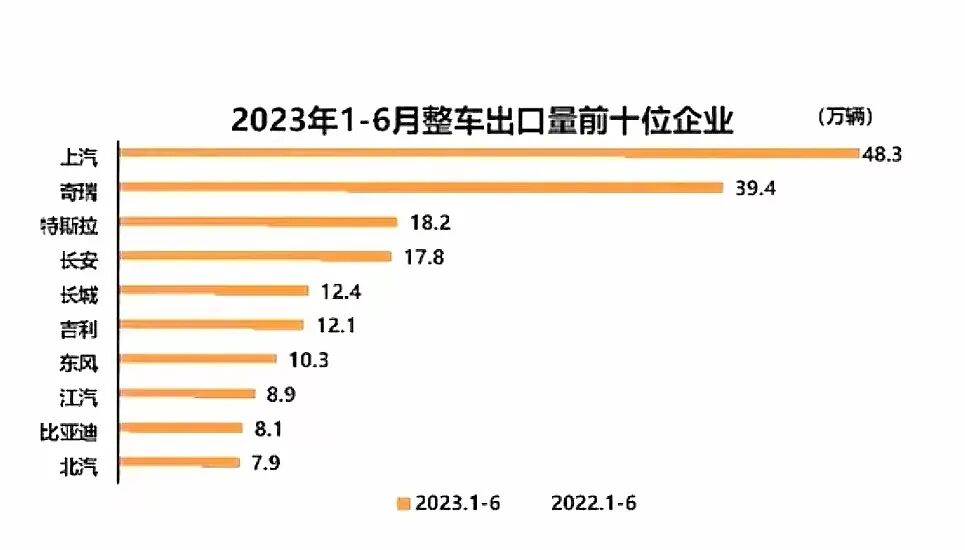 在汽车出口前十企业中,上汽集团稳居第一,奇瑞集团排名第二,特斯拉第三,比亚迪出口销量猛增,上半年出口8.1万辆,增长超10倍。