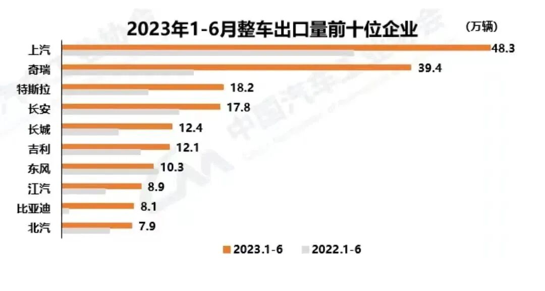 我国汽车出口的前三名分别是:上汽集团、奇瑞集团、特斯拉中国,上汽集团上半年整车出口接近50万辆,奇瑞接近40万辆,特斯拉出口18.2万辆。