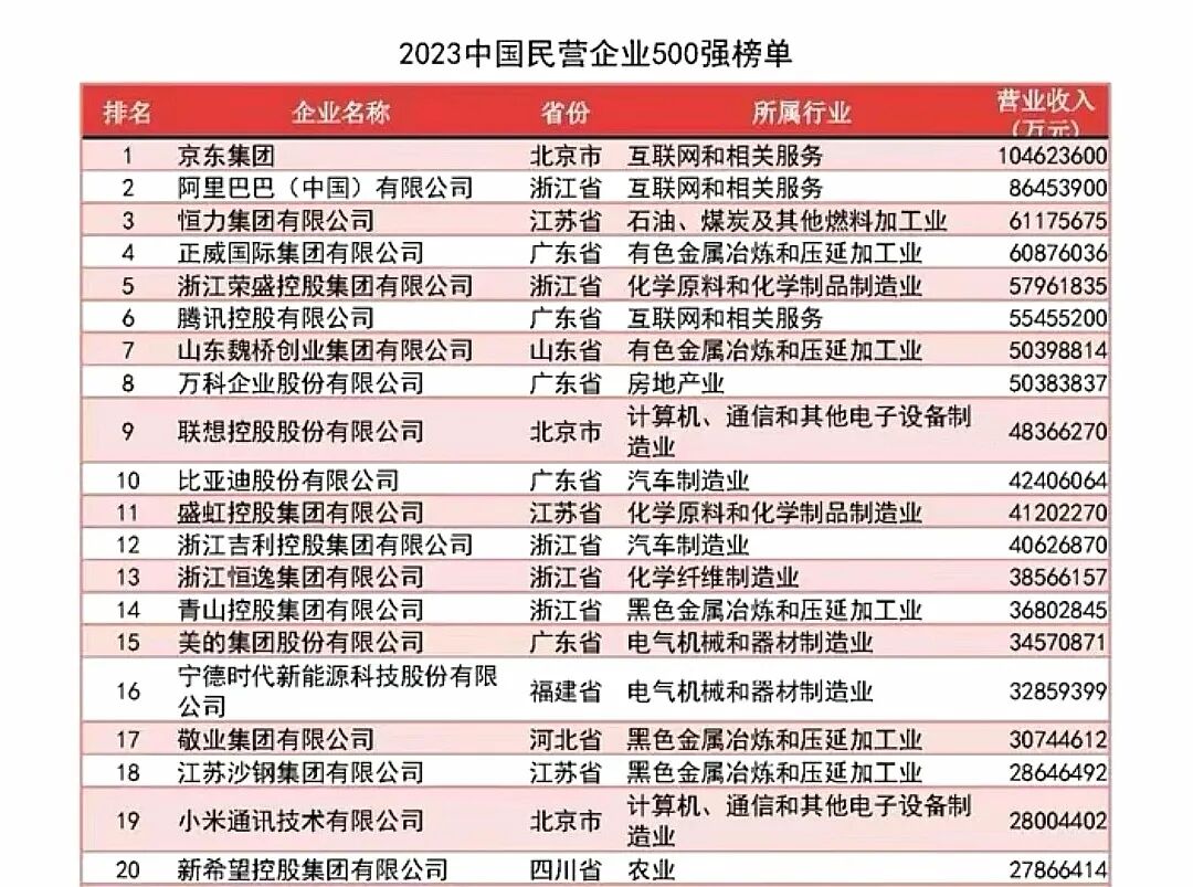 在本次榜单中,京东集团营收规模超过1万亿元,也是我国唯一营收突破1万亿的民营企业,京东成功跻身中国最大民企之位。